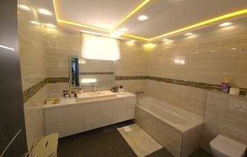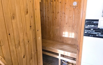A fenti fürdőszoba kádas és zuhanyzós kialakítású, piszoárral és beépített szaunával, a wellnes-élmény otthon is adott.