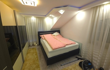 a felső szinten három tágas szoba található, mindegyikből közvetlen kijárat nyílik az erkélyre (összes 3 db) így a ház egész emelete világos és jól átszellőztethető.