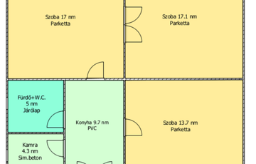 Helyiségei: 3 szoba, előtér, fürdőszoba, konyha, kamra/padlásfeljáró.