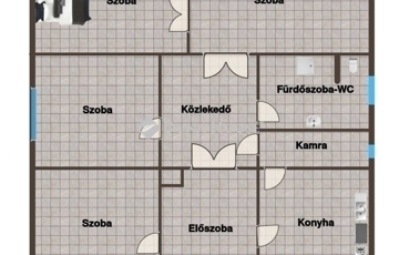 A fedett teraszról nyílik az előszoba, ahonnan elérhető a konyha és egy szoba, amely akár étkezőként is használható. A közlekedőből nyílik a kamra, a fürdőszoba, a WC és egy másik hálószoba. Az utcafronti tágas nagy szobából egy kisebb helyiség nyílik, amely kiváló lehet dolgozószobának, gardróbnak vagy gyerekszobának.