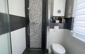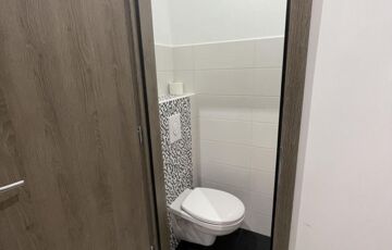 Az előszobából nyílik két külön bejáratú szoba, a konyha–étkező, a mosókonyha, a zuhanyzós fürdőszoba kétállású mosdóval és WC-vel, valamint egy külön WC is.