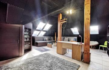 Az emeleten további tágas nappali (jelenleg klubszoba és konditerem), egy hálószoba, fürdőszoba és szauna kapott helyet, így a ház tökéletes a teljes kikapcsolódáshoz, akár két generáció számára is.