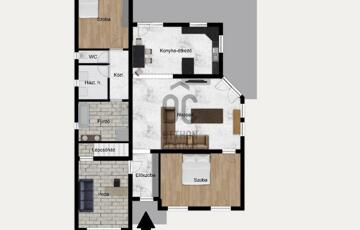 A földszinten tágas, egybenyitott nappali–étkező–konyha fogadja, mellette két hálószoba, külön fürdőszoba és WC. A fedett előtérből nyíló, jelenleg irodaként használt helyiség könnyedén átalakítható garázzsá vagy további szobává, de vállalkozási célokra is ideális.