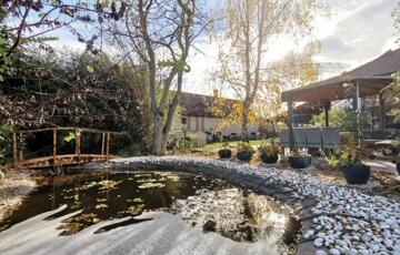 A hangulatos udvar valódi élménytér: hőszivattyús fűtésű medence keringetőrendszerrel, sütögetőhely, két pagoda, valamint bőséges tér a családi és baráti összejövetelekhez.