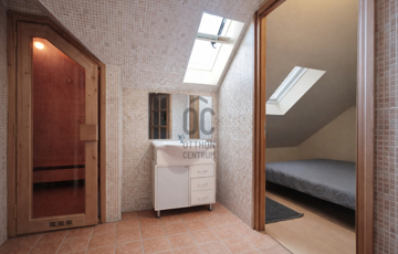 Az emeleten további tágas nappali (jelenleg klubszoba és konditerem), egy hálószoba, fürdőszoba és szauna kapott helyet, így a ház tökéletes a teljes kikapcsolódáshoz, akár két generáció számára is.