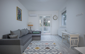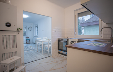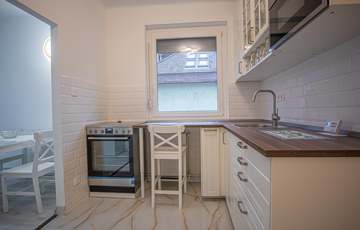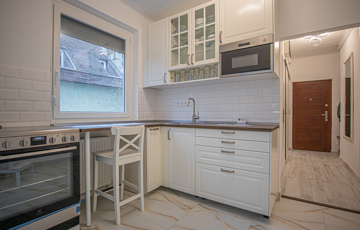 A lakás teljes mértékben bútorozott (kanapé, étkező asztal székekkel, szekrény, gépesített konyha, mosógép, beépített szerkény) és felszerelt, a kisebbik szobába még érkezik egy franciaágy.