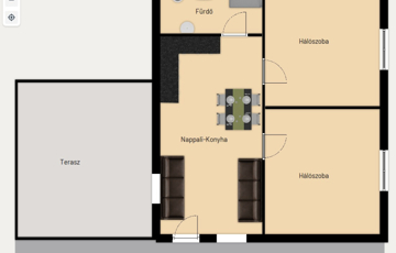 A lakás nagy terekkel rendelkezik. a 30 m2-es amerikai konyhás nappali mellett két 20 m2 feletti hálószoba található.