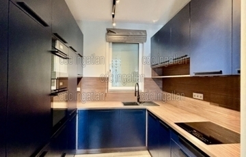 Az előszobából nyílik egy kisebb dolgozó, vagy vendégszoba, majd az egyedi, sötétkék színű, teljesen gépesített konyhába jutunk, amely a nappalival egy légtérben található.