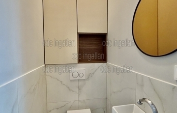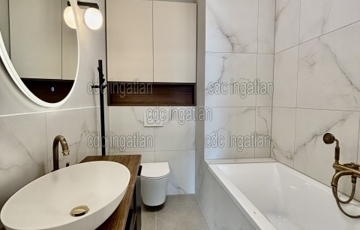 Az előszoba része egy háztartási/gépészeti helyiség, valamint egy különálló WC is. A nappaliból igényes tolóajtón keresztül érhető el a nagy méretű hálószoba, amelyhez saját gardrób és kádas fürdőszoba tartozik. Helyiségenként szabályozható, 4 zónás padlófűtés és mennyezethűtés, 8 kW-os Midea levegő-víz hőszivattyúval. Prémium minőségű burkolatok (olasz csempe stb.). Hőszivattyús használati melegvíz-ellátás 160 literes indirekt tárolóval. Teljesen gépesített konyha AEG készülékekkel és gránit mosogatótálcával. Okostelefonról vezérelhető, mindenhol elérhető LED világítás.