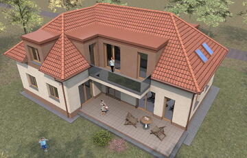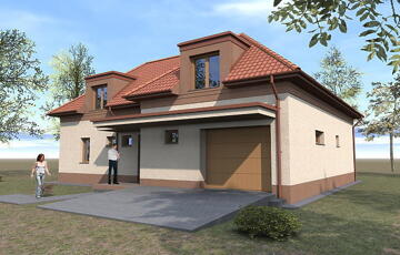A ház kialakítása: a földszinten egy hálószoba, az emeleten négy további hálószoba, három fürdőszoba és külön WC kap helyet. A nappali, a konyha és az étkező tágas egybefüggő teret alkot. A nappaliból nyílik egy 25 m2-es terasz is. A fűtés, hűtés hőszivattyúval megoldott. A praktikumot a garázs és a külön tároló tovább növeli. 3x25 A elektromos kapacitás normál és H tarifával biztosítja a költséghatékony üzemeltetést. A burkolatok, belső ajtók, szaniterek és a térkövek választhatóak.
