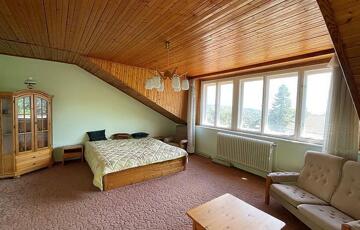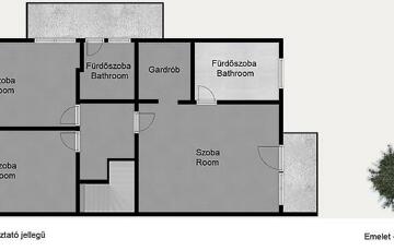 Az emeleti szinten kialakításra került egy keleti fekvésű, utcai nézetű, szép kilátással rendelkező, tágas szoba, egy hátsó kertre néző, nyugati fekvésű, erkélykapcsolatos szoba, egy erkéllyel rendelkező, benapozott közlekedő és egy kényelmes méretű fürdőszoba. Igény szerint a szinten kialakítható 3 szeparált háló és 2 fürdőszoba is.