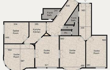 Szobái tágasak és nagy üvegfelületeiknek köszönhetően jó fényviszonyokkal rendelkeznek. Jelenlegi kialakításában 2 konyha és 2 fürdő kapott helyet. Az egyik fürdő zuhannyal és wc-vel, míg a másik káddal szerelt. Ezen felül egy külön wc is található a lakásban.