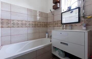 A nagyobb, körülbelül 85 m²-es házrész jó állapotú, fűtését és melegvíz-ellátását Ariston gázkazán biztosítja. A ház betonfödémes, a tetőtér beépíthető, így bővítésre is van lehetőség. A nyílászárók mindenhol modern, műanyag kivitelűek, redőnnyel és szúnyoghálóval felszerelve.