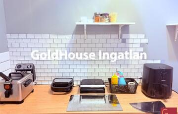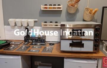 Berendezés: hűtő, mosogató, pult, székek, asztalok, elektromos pizzakészítő gép, szendvics és krumplisütő, rezsó, kávédaráló, kávégép, melegen tartó pult, állványok, egyéb konyhai eszközök.