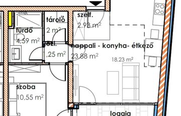 A 1 db amerikai konyhás nappalival, 1db hálószobával, 1 db fürdőszobával, közlekedővel, loggiával rendelkezik.