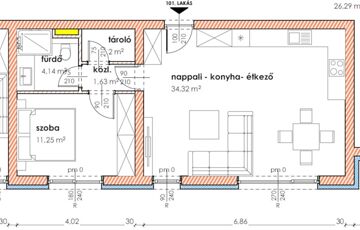 A 1 db amerikai konyhás nappalival, 1db hálószobával, 1 db fürdőszobával, közlekedővel, loggiával rendelkezik.
