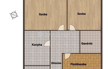 -praktikus elrendezés: előszoba, konyha, bejárható gardrób, kamra, fürdőszoba WC-vel.