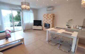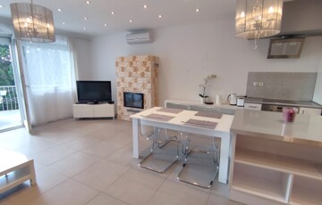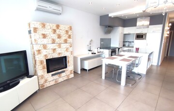 Az amerikai konyhás étkező-nappali hatalmas ablakain árad be a napfény, az erkélyről pazar kilátás nyílik a belső kertre és a medencére. Az elektromos kandalló kellemes hangulatot áraszt. Az ablakok redőnyökkel felszereltek. A lakást 2006-ban teljeskörűen felújították.