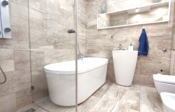 A fürdőszobában kád és zuhany, wc és bidé is használható. Külön vendég wc is van.