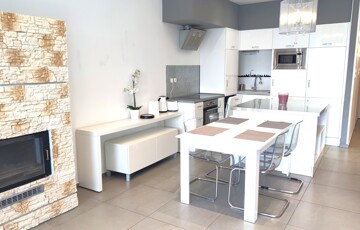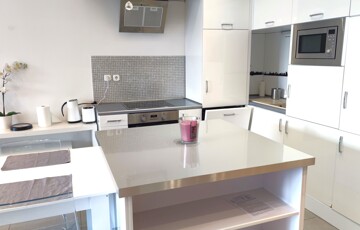 A konyha elektromos tűzhellyel, mosogatógéppel, hűtővel, mosógéppel felszerelt, konyhasziget is tartozik hozzá.