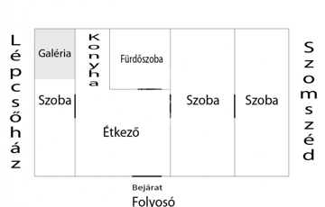 A lakás az első emeleten helyezkedik el, 3 szobából, étkezőből, főzőfülkéből és fürdőszobából áll.