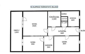 - Helyiségei: 1 nappali, 2 háló, gardrób, konyha, kamra, fürdőszoba, WC, előszoba.