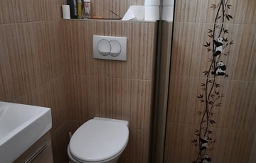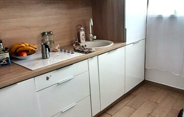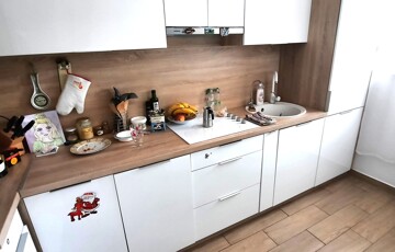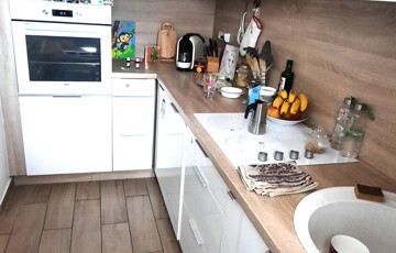 A konyha ízlésesen berendezett, gépesített, teljes berendezéssel a vételár részét képezi. A fürdőszoba szintén.