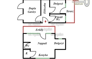 - A földszinten egy dupla garázs, dolgozó szoba és egy tusolós wc található.