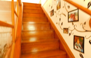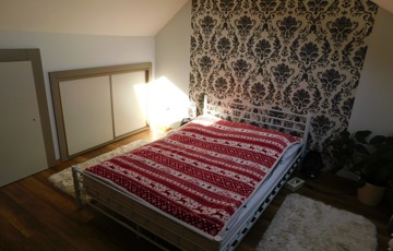 A tetőtérbe az előszobából egy felújított, elegáns mahagóni falépcső vezet. Itt található egy fürdőszoba, melynek erkélyéről gyönyörű kilátás nyílik a Tamás-hegyre – egy reggeli kávé vagy esti elcsendesedés tökéletes helyszíne. A fürdő programozható elektromos padlófűtéssel felszerelt, a meleg vizet pedig külön, 80 literes villanybojler biztosítja. A mellette kialakított hálószoba inverteres hűtő-fűtő klímával gondoskodik a komfortos pihenésről minden évszakban.
