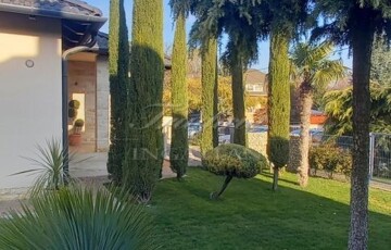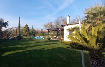 Az 1830 m2-es gyönyörűen karbantartott, parkosított, trópusi, mediterrán hangulatú telken a ház mellett egy medence, egy kazánház és egy fedett tároló is helyet kapott.
