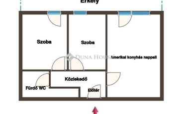 A 104 lakásos lakóparkban gondozott belső kert,és 24 órás házfelügyelet is van. A hét emeletes lakópark alsó szintjén üzletek és kényelmi szolgáltatások vehetők igénybe. A hatodik emeleten lévő lakás 47, 90 m2 nettó alapterületű+9,84 m2 erkély tartozik hozzá. A lakótérben amerikai konyhás nappali, két hálószoba, előtér,kádas fürdőszoba, közlekedő van.