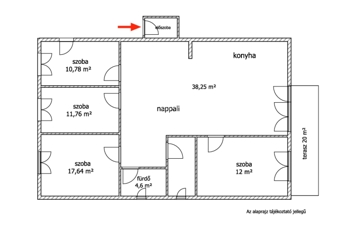 Főház: 4 hálószoba, amerikai konyhás nappali, 2 fürőszoba, előtér, 20 nm fedett terasz.