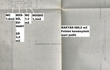 A raktározásra, gyártásra alkalmas terület 689,5 m2, az iroda és szociális rész pedig 36,5 m2, ami két irodát, két wc-t, két mosdót, és egy zuhanyzót tartalmaz. Az iroda megközelíthető, személyi bejáraton keresztül kívülről is és a csarnokon belülről is.