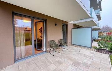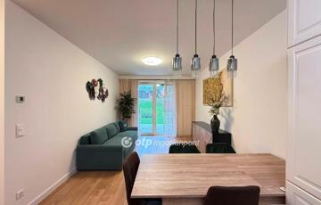 A modern építészeti irányzatoknak megfelelő, liftes, négyemeletes társasház kifinomult megjelenésű és praktikus elrendezésű. A biztonságos, zárt és ízlésesen kialakított lépcsőházból a tágas, beépített gardróbbal ellátott előszobába léphetünk. Bal oldalon található a kádas fürdőszoba, egy különálló tárolóhelyiség, valamint a hálószoba. A lakás központi része a világos, keleti fekvésű, amerikai konyhás nappali, amely közvetlen kijáratot biztosít a teraszra és a gondozott kertre, mind a nappaliból, mind a hálóból megközelíthetően.