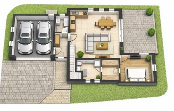 - Földszint: előtér, amerikai konyhás nappali étkezővel, hálószoba, gardrób, fürdőszoba, háztartási helyiség, garázs, terasz.