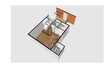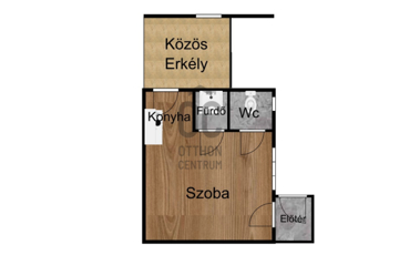 A lakás mérete 14,24m²-es + 7,2m2 közös erkélyes, elrendezése: előtér, konyha, fürdő, wc és egy szoba.