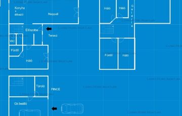 <p><strong>Pinceszint:</strong> elektromos kapuval ellátott kétállásos garázs, melyből közvetlen bejutás biztosított a házba, gépészeti helyiség, tárolók, gardrób, kamra mosógép kiállással.</p>
