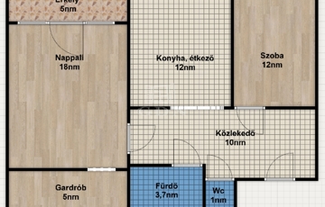 A lakótérben egy kényelmes közel 11nm-es közlekedő, az abból nyíló, 12nm-es ablakkal ellátott konyha-étkező, 3,7nm-es szellőztethető fürdőszoba, illetve külön helyiségben kialakított wc. a 18nm nagyságú erkélyes nappali és az abból nyíló 5nm gardrób helyiség, valamint a közel 12nm-es szoba került kialakításra.