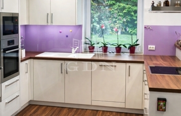 Az egyedi tervezésű konyhabútor beépített gépekkel, kerámialapos főzőlappal felszerelt.