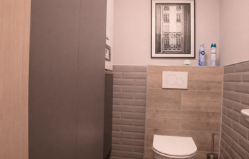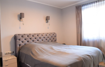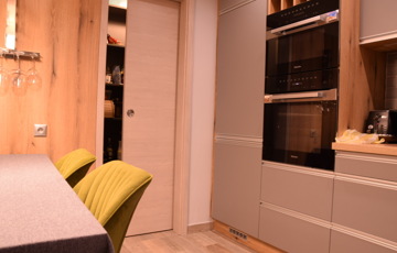 A belső tereket lakberendező tervezte, az egyedileg gyártott beépített bútorok minden helyiségben jelen vannak – előszobától a fürdőig.