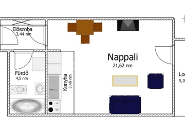 - Fürdőszoba-WC 1 helyiségben: mosógép kiállás biztosított;