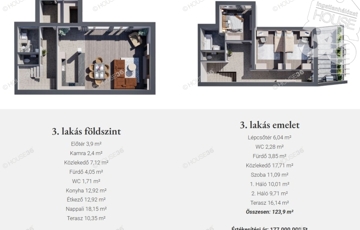 3-as lakás, 2 szintes, 123,9 m2 + 2 terasz, 16,14 és egy 10,35m2-es. Nappali + 3 szoba, dupla fürdő.