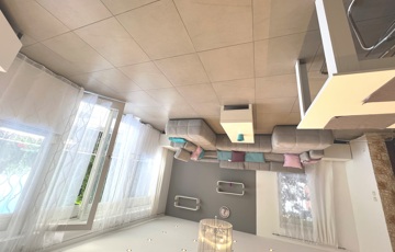 A lakás feletti, 2. emeleti ingatlan szintén eladó: 95 m2-es amerikai konyhás nappali + 2 szoba, 2 fürdőszoba, gardrób, kamra, nagy terasz elosztású.