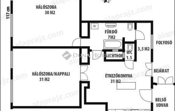 A lakásba lépve tágas konyha és étkező fogad, ahonnan egy hangulatos, növényekkel teli belső udvarra is kiléphetünk.