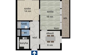 - Nappali, konyha, szoba, étkező,WC, fürdő, erkély, közlekedő.