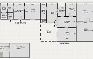 Az I. generációban 3 szoba, étkezős konyha, előszoba, kamra, fürdőszoba és terasz található. A II. generációs részben konyha, szoba és fürdőszoba került kialakításra. A víz-, villanyhálózatot cserélni kell. A fűtést gázkazán biztosítja, lapradiátorok adják le a hőt. A burkolatok közepes állapotúak. A két rész külön bejárattal rendelkezik. Egy 15 m2-es terasz, egy 25 m2 pince és több melléképület áll rendelkezésre. Egy kisebb méretű autóval be lehet állni a telekre.