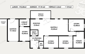 - Lakótér 110,28 m2, garázs 17,10 m2, terasz 14 m2, tároló 3,3 m2, 480 m2 telek (lásd alaprajzon)