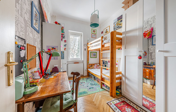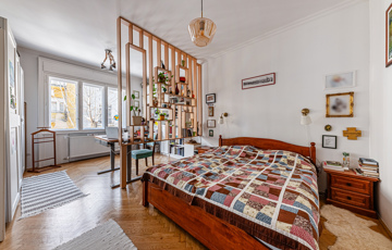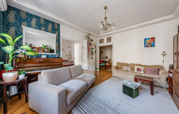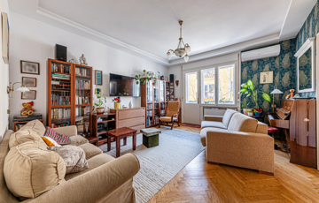 A lakás a második emeleten található, klasszikus elrendezése tágas, jól arányos tereket biztosít.