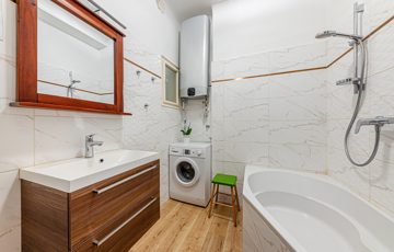 Az ablakos fürdőszobában kényelmes méretű kád, fiókos mosdószekrény és energiatakarékos villanybojler található.