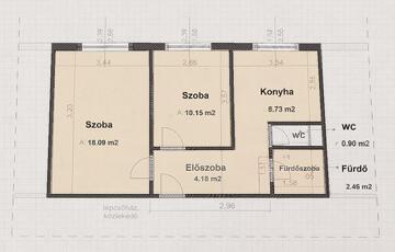 2 szoba, konyha, kádas fürdőszoba, mellékhelyiség, előszoba.